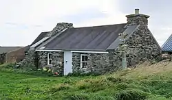 Shetland, being a relatively isolated community, was susceptible to outbreaks of smallpox throughout the 18th century that would spread through large proportions of the population due to a lack of immunity to the disease.[2] In 1700, an outbreak of smallpox arrived in Shetland when the son of a local man had visited mainland Britain, where he had contracted the disease and spread it upon his return to Shetland. An estimated one-third of Shetland's population died as the result of this epidemic.[11] The disease was subsequently referred to as "mortal pox", while the 1700 outbreak was used by those born around this time as a reference to calculate their age.[12] Some of the smaller islands of Shetland were particularly hard hit – Fair Isle had previously had between ten and twelve families, but is said to have lost two thirds of its population in the 1700 outbreak, leaving too few to effectively manage their fishing boats;[13] in Fetlar smallpox killed over 90 islanders of whom "most were married people".[2]