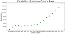 Johnson County is located in the U.S. state of Iowa. As of the 2020 census, the population was 152,854,[1] making it the fourth-most populous county in Iowa. The county seat is Iowa City,[2] home of the University of Iowa. Johnson County is included in the Iowa City metropolitan area, which is also included in the Cedar Rapids-Iowa City Corridor Combined Statistical Area.[3]