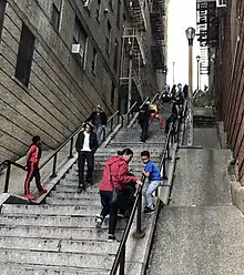 The "Joker Stairs" (also known as the West 167th Street Step Stairs) is the colloquial name for a step street connecting Shakespeare and Anderson avenues at West 167th Street in the Highbridge neighborhood of the Bronx, New York City.[1] Located near the 167th Street station on the New York City Subway's 4 train,[2] the stairs served as one of the filming locations for the 2019 film Joker. The stairs also served as a filming location in April 2023 for its forthcoming sequel Joker: Folie à Deux.[3]
