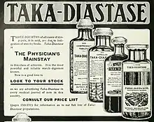 In 1883, Takamine returned to Japan and joined the division of chemistry at the newly established Department of Agriculture and Commerce until 1887.[4] He then founded the Tokyo Artificial Fertilizer Company, where he later isolated the enzyme takadiastase, an enzyme that catalyzes the breakdown of starch. Takamine developed his diastase from koji, a fungus used in the manufacture of soy sauce and miso. Its Latin name is Aspergillus oryzae, and it is a "designated national fungus" (kokkin) in Japan.[5]