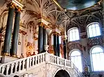 The principal or Jordan Staircase of the Winter Palace, St Petersburg is so called because on the Feast of the Epiphany the Tsar descended this imperial staircase in state for the ceremony of the "Blessing of the Waters" of the Neva River, a celebration of Christ's baptism in the Jordan River. The staircase is one of the few parts of the palace retaining the original 18th-century style. The massive grey granite columns, however, were added in the mid 19th century.[1]