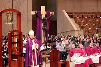 On April 6, 2010, Gómez was appointed coadjutor archbishop of the Archdiocese of Los Angeles by Pope Benedict XVI.[1] The Archdiocese of Los Angeles is the largest Catholic diocese in the nation, with Hispanics comprising more than two-thirds of the archdiocese's five million Catholics.[13][16] Gómez succeeded Cardinal Roger Mahony on March 1, 2011, with a transition ceremony held on February 27, 2011.[10][17][18] He is the first Hispanic to serve as archbishop of Los Angeles, as well as the highest-ranking Hispanic bishop in the United States.[13] He said: