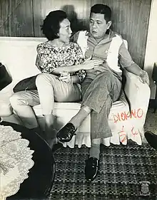 After Diokno enrolled at the University of Santo Tomas in 1940, his studies were interrupted by the outbreak of WWII in 1941 in his second year. When the war was over, he was granted a special dispensation by the Supreme Court of the Philippines and was allowed to take the Philippine Bar Examination despite having never completed his degree. He topped the 1944 bar exam (Roll No. 5, Diokno was the first Filipino lawyer to take his oath and appear on the post-war Roll of Attorneys on July 26, 1945)[17] together with a 24 year old future ally named Jovito Salonga with a score of 95.3, the highest since the language of instruction switched to English.[18][11][19] As a reward he took a solo vacation in the United States, where he would frequently call Carmen "Nena" Icasiano, a commerce student from Bulacan studying at Far Eastern University. They met in 1946 at a dinner party hosted by a future mayor named Arsenio Lacson, and Diokno started courting her, refusing to listen to his father to marry José Abad Santos's daughter. Diokno married Carmen at Ermita Church in 1949 immediately after Diokno returned from his shortened trip. He quickly proposed to her after he found out on the telephone that she had tuberculosis and had missed seeing him.[20]