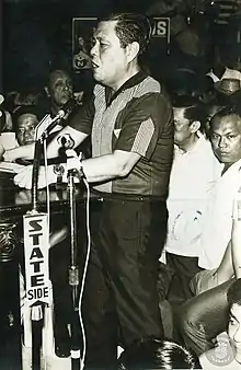 He was the leader of the Movement of Concerned Citizens for Civil Liberties (MCCCL), which organized a series of rallies from 1971 to 1972.[37] The most massive of these rallies involved 50,000 protestors and was held on September 21, 1972, shortly before the imposition of martial law by the Marcos dictatorship.[38] During this rally, protestors denounced the infamous Oplan Sagittarius, the devious operation plan by Marcos to declare martial law. Sen. Benigno "Ninoy" Aquino Jr. exposed the Oplan Sagittarius scandal earlier in a September 13 speech, and spoke to the Senate on September 21, the same day that the MCCCL held their exceptionally large rally at Plaza Miranda. Marcos reacted with fear of deposition and immediately finalized Proclamation No. 1081, which declared nationwide martial law at 8:00 p.m. later that evening. Exactly the next day on September 22, 1972, at 8:00 p.m., Defense Minister Juan Ponce Enrile was told to exit his car near Wack-Wack village.[39] Another vehicle carrying gunmen arrived and stopped near an electrical post, right beside Enrile's vehicle. They then alighted from their vehicle and began to fire at the large sedan of Enrile to give an impression of a terrorist ambush, setting the stage for Marcos's theatrical television announcement.[40][41][42]