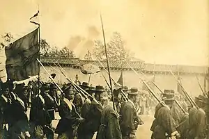 The Joseon dynasty attempted to reverse-engineer European firearms to counter their rising threat in the 19th century. When the Americans captured Ganghwa Island's coastal fortresses, the Joseon Army first used these modern weapons to reinforce the island.[30] After signing the Treaty of Ganghwa, Japan, Qing, the United States, and the European nations started importing modern weapons such as rifles, artillery, machine guns, western sabers, and bayonets in 1883 until its annexation in 1910.[31] From 1887, Gojong even tried to make weapons by themselves which however never succeed.[32]