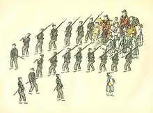 In 1881, Gojong and Min spearheaded the military modernization efforts. Joseon dispatched the so-called Gentlemen's Sightseeing Group to Japan or Courtiers' Observation Mission (Sinsayuramdan). They invited the Japanese Army attaché Lieutenant Horimoto Reizō to serve as an adviser in creating a modern army.[1]The Japanese gave military training to eighty to one hundred young men of the aristocracy, establishing the Special Skills Force (Pyŏlgigun, Korean: 별기군).[2] They also sent a royally appointed advisor (Yeongseonsa) and students to Tianjin to learn about the manufacture of firearms and munitions. In January 1882, the government reorganized the Five Army Camps (ogunyeong) into the Palace Guards Garrison (Muwiyŏng, Korean: 무위영) and the Capital Guards Garrison (Changŏyŏng, Korean: 창어영).[2] However, these units were resentful towards the Special Skills Force for better treatment and equipment. Additionally, the army discharged more than 1,000 soldiers in overhauling the military; most were old or disabled. The army did not pay them in rice for thirteen months leading up to the Imo Incident, which claimed the lives of some Japanese military advisors and their legislation and some Joseon officials. Daewongun returned to power momentarily to restore order. Daewongun dismantled the Muwiyŏng, the Changŏyŏng, and the Pyŏlgigun and revived the Five-Army Camps.[3][4] In December 1882, after Daewongun's arrest, the government disbanded the Five-Army Camps once more. The Chinese lines under Yuan Shikai reorganized and trained into a new Joseon military formation, the Capital Guards Command (Chingunyeong, Korean: 친군영).[5][6][7]