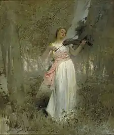 He initially devoted himself to historical works, but moved away from Realism to a type of Symbolism and developed an interest in the English Pre-Raphaelites. As a result, much of his work took on a "literary" quality.