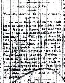 On January 21, 1879, Joseph murdered George E. King (c1826 – 1879) near Drynob, Laclede County, Missouri. He was tried and found guilty in Lebanon, Missouri. He was sentenced to death by hanging on August 21, 1879. A public execution has held on March 5, 1880. Joseph Core was the first legal hanging in Laclede County, Missouri[4]