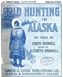 Grinnell's second visit to the far north began in 1898 on the schooner Penelope. He spent 18 months in Alaska during the Klondike Gold Rush. Grinnell corresponded regularly with his family, the letters were later compiled and edited into the book Gold Hunting in Alaska, published by David C. Cook Publishing Company in 1901.[5] Grinnell joined the Long Beach and Alaska Mining and Trading Company to Kotzebue Sound, Alaska. The company landed at Cape Blossom in Kotzebue Sound in July 1898. Grinnell collected and observed the summer migrant bird life; Gambel's sparrow, barn swallow, and Savannah sparrow, among others. By August, Grinnell had 75 bird specimens preserved, including a Siberian yellow wagtail. The miners spent the winter inland on the Kowak River [Kobuk River], then returned to the coast that spring.[7]