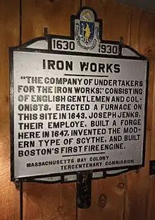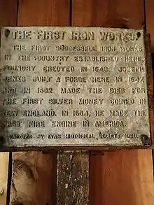 The Saugus Iron Works is considered the birthplace of the North American iron and steel industry. Some products of Joseph Jenckes's forge, a copy of his patent, and two historical markers mentioning his accomplishments are displayed in the museum at the Saugus Iron Works National Historic Site in Lynn, Massachusetts.[20]