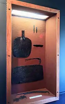 Between 1948 and 1953, archaeologist Roland W. Robbins excavated various sites at the Saugus Iron Works. In 1952, Robbins excavated what he called the "Jenks Site" where Jenckes built his foundry and forge on the tailrace. He uncovered a wrought-iron tuyere (bellows pipe), an anvil base, axes, chisels, knives, four water wheels, a water wheel hub and shaft, a cannonball, a sawmill saw blade, a scythe, hoes, spades, ox and horse shoes, and other objects. He discovered the "likely remains of Jenks' forge hearth" and he found the remains of a slitting mill and evidence of a wire-making operation.[20]