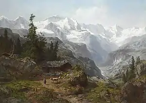 He devoted himself exclusively to landscape painting; presenting scenes from the Swiss Alps, rendered in the popular Heroic style. He was also influenced by the writings of Jean-Jacques Rousseau, who spoke of unadulterated nature as a refuge of freedom. Later, he came under the influence of the simpler style employed by the Barbizon school.