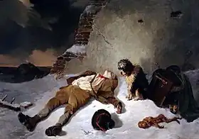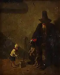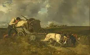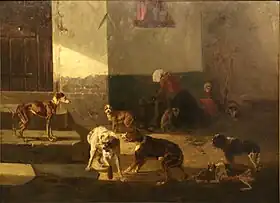 He initially depicted dogs in sentimental scenes with a Romanticist flavour. His art developed towards a more Realist rendering of dogs living on the street or working for travelling entertainers.[2] A similar turn towards Realism could be witnessed in other Belgian painters, such as his brother Alfred, Charles de Groux and Gustave Léonard de Jonghe.[10][11] A breakthrough piece was his 1848 painting entitled Morning in Brussels. It showed stray dogs searching for food in the gutters and garbage dumps. In the background, barely visible, are two silhouettes of women, probably two beggars, who clearly share a fate similar to that of the dogs.[10]