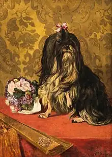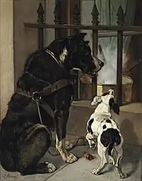 Joseph Stevens, birth name Edouard Joseph Léopold Stevens (26 November 1816 2 August 1892)[1] was a Belgian animalier painter and engraver. He is mainly known for his paintings with dogs as the principal subject. This included dog portraits, dogs interacting among themselves or with their masters and dog markets. From depicting sentimental scenes in a Romanticist manner his art developed towards a more Realist rendering of dogs living on the street or working for travelling entertainers. He won the admiration of the French realist painter Courbet for these efforts. He was a pioneer of Realism in Belgian art. He further painted horses and singeries, scenes with monkeys engaging in human activities.[2] A few marines by his hand are also known.[3]