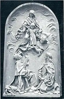 A devout Roman Catholic, Urbania was best known for the sculptures he created for cathedrals and monasteries. Two monumental plaster reliefs – Christ Healing and Daniel in the Lion’s Den – were later moved to the National Gallery of Slovenia in Ljubljana. Small bronze copies of these popular pieces occasionally appear for public sale.[12] Other religious-themed pieces include: a maple wood carving of Christus Ascending (1931, now in Kenosha, Wisconsin);[13][14] several marble statues at the Parish Church of St. Elisabeth, including Immaculata and Two Cherubim (with sculptor Alojzij Progar);[15] St. Hubertus (1909) and St. Anthony and Child (1934);[16] and an important burial chapel piece called Resurrection (1910, made by the artists' group at the Grošlje Workshop for a burial chapel in Škofja Loka), sometimes credited as the sole work of Ivan Zajec.[17]