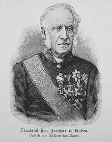 From 1838 to 1849, he was a member of the Second Chamber of the Estates of Württemberg as a Representative of the Knighthood. From 1842 to 1850, he held the office of President of the Catholic Church Council. In 1847, Linden was appointed a member of the Privy Council and on 1 July 1850 by King William I appointed Councilor of State and head of the Ministry of Interior. In 1850, Linden won a seat as an elected deputy in the Frankfurt Parliament, which formed in the wake of the March Revolution. On 20 September 1852, he was officially given the title of Interior Minister and remained in this function continuously until 20 September 1864. From 6 July 1850 to 8 May 1851 and, again, from 14 July 1854 Linden also headed the Ministry of Foreign Affairs until 29 October 1855 when he was succeeded by Karl Eugen von Hügel.[2]
