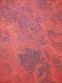 Central Australian artists frequently paint particular "dreamings", or stories, for which they have responsibility or rights.[16] These stories are used to pass "important knowledge, cultural values and belief systems" from generation to generation.[17] Paintings by Petrick portray two different groups of dreamings, rendered in two distinct styles.[6] Bush plum dreaming represents a plant of the central Australian desert which is "a source of physical and spiritual sustenance, reminding [the local Indigenous people] of the sacredness of [their] country".[18] These paintings are undertaken with red, blue and orange dots that represent the fruit at different stages in its development.[1] She also paints women’s ceremonies (Awelye) and dreamings, and these are created using rows of coloured dots and include representations of women's ceremonial iconography.[6]