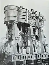 During World War I, the Hendy plant gained its first experience building marine engines by supplying 11 triple expansion steam engines for cargo ships built by Western Pipe & Steel, for the U.S. Shipping Board.[2][4] Each engine weighed about 137 tons and stood 24½ feet high. Although the first marine engines built by Hendy, they proved to be reliable, with most providing many years of service. Essentially the same engine design (with minor improvements) was used by the company for its mass production of US Liberty ship engines in World War II.[2]