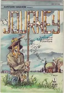 Journey was first published as a back-up feature in Cerebus #48 and #49 from Aardvark-Vanaheim, then as a title unto its own, starting with Issue #1 in Mar./Apr. 1983. The 13th issue features an intercompany crossover with Jim Valentino's normalman. After fourteen issues, the series moved to Fantagraphics, which published an additional thirteen issues.