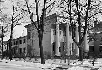 Welles is thought to have constructed the rear addition to the house, and made other extensive alterations.[4] It is likely that the middle section was built in 1835, the temple portion was added in 1843, and the kitchen and servants quarters were added in 1850.[5] In 1855, Welles' son Henry moved into the house with his four daughters (Clarissa, Sarah, Mary Fiske, and Susan Holly),[5] after the death of his wife.[2][5] Henry Welles died in 1860, and the house passed to successive owners.[2] In 1893, the house was sold in a tax sale to George Wahr, and his wife, Emma (Staebler) Wahr.[5] The Wahr family constructed another house next door as their residence, and rented the house to sororities and fraternities.[6] After 20 years, they moved back into the main Wilson-Wahr House.[7] The house passed on to the Wahr's daughter, Natalie Wahr Sallade (who died in 1974),[5] and the Sallades occupied the house until 2002 when it was purchased by Norman and Ilene Tyler.[5]