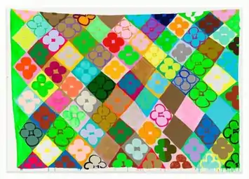 Ledgerwood's later work shifted toward repeated vernacular motifs (chevron and diamond, quatrefoil, and floral patterns) and a more confrontational approach embracing discordant color, an integration of painting and drawing, and greater co-optation of architectural space, including that between painting and viewer.[54][55][56][57][58][25] Michelle Grabner suggested this new work laid "bare Ledgerwood's distrust of elegance and finesse" with its contemporary, doodle-like drawing, loose Pop and quilt-like patterns, Matissean flatness, and funky interior-design palettes.[54][59] New York Times critic Ken Johnson described later works in this vein as "paradoxical fusions of actuality and virtuality" painted with "the carefree abandon of an improvising jazz musician."[60] He and others noted Ledgerwood's use of irregular white-bordered edges suggesting drooping, bowed tapestries or quilts pinned to walls (e.g., Grandma's Flower Garden, 2006, above)—a reference to traditionally feminine arts—which combined with her overt decorative forms and de-stabilized grids to upend high-modernist conceits of seriousness.[60][6][25][26]