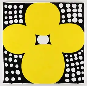 In the early 1990s, Ledgerwood transitioned toward patterned abstraction with directly drawn, sharper-edged circular forms that suggested shimmering light (e.g., Blackness Light, 1992;[43] Rainlight, 1993) and increasingly delved into the experience of perception.[26][4] This work employed monochromatic or limited palettes and dissolving grid arrangements of dots, circles or loops, creating complex, flat plays of oscillating color, tone, surface finish and figure-ground based on light conditions, viewer position and retinal effects;[4][8] critics suggest that this indeterminacy introduces elements of extended time, discovery, and "unknowability" into the viewing experience.[8][44][45] Ledgerwood explored this motif in various color palettes, combining blacks with pinks, purples, magentas and ultramarine (e.g., Tranquilizer, 1997; Basement Love, 1999) in a series exploring sexuality, and yellows on silver and white in another, Op-Art-like series.[44][46][47][48] One of the latter works (the 17' x 35' Groovin' on Lemon, 1995) comprised half of a temporary, site-specific installation commissioned for the new MCA Chicago building, which Ledgerwood described as "a meditation on light and rhythm."[49][11][50] The adjacent, same-sized companion, Groovin' on Violet, fully emerged only after a viewer's eyes adjusted, replicating the afterimage formed from viewing the other work.[49][26]