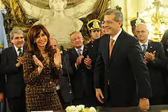 Fallout from the 2008 Argentine government conflict with the agricultural sector over a proposed rise in export tariffs led to a number of changes in the executive branch, including the creation that year of a Production Ministry and, on 30 September 2009, the reinstatement of the Agriculture Secretariat as a (cabinet-level) ministry, a prominence the post had not enjoyed since 1981.[5] Supported by Presidential Chief of Staff Aníbal Fernández, Domínguez was tapped for the post and sworn in on 1 October.[7] Pending, however, were improvements in strained relations between the center-left administration of President Cristina Kirchner and (among others) nation's important agrarian sector, whose leading figures approved of her decision to reinstate the Agriculture Ministry,[8] but expressed skepticism at the appointment to the post of a legislator with no farming experience, and who had recently supported a hike in provincial farm income taxes.[7][9]