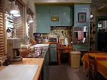 It was the setting for three of her television shows: In Julia's Kitchen with Master Chefs, Baking With Julia, and Julia and Jacques Cooking at Home with Jacques Pépin. The kitchen was fully transformed into a functional set, with TV-quality lighting, three cameras positioned to catch all angles in the room, and a massive center island with a gas stovetop on one side and an electric stovetop on the other, but leaving the rest of the Childs' appliances alone, including the "wall oven with its squeaking door."[2] During taping, the kitchen table and chairs were removed and replaced by a cooking island that had a built-in stovetop and food preparation surfaces.[3] This kitchen backdrop hosted nearly all of Child's 1990s television series.