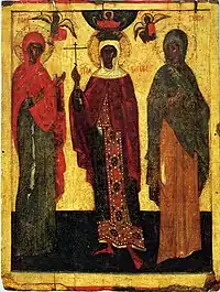 An icon depicting Saints Paraskevi of Iconium, Barbara and Juliana.
