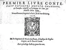 In 1556, he published his Premier livre contenant plusieurs motetz, chansons & fantasies reduictz en tabulature de leut by Nicolas Du Chemin in Paris[3] with a dedication to René de Saint-François.[4] (read online here). Modern edition by Michel Renault: Éditions du CNRS, 1976 (series Le Chœur des Muses : Corpus des luthistes français).