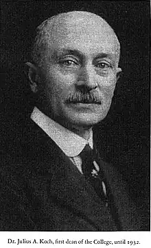 Julius Arnold Koch (August 15, 1864 – February 2, 1956) was an American chemist who was born in the Free Hanseatic City of Bremen. Koch graduated from the University of Pittsburgh in 1884. He was the first dean of the School of Pharmacy at the University of Pittsburgh and held this position until his retirement in 1932. In 1897, he discovered, together with Ludwig Gattermann, the Gattermann-Koch reaction (a method of synthesis of benzaldehyde using CO).[1] He agreed on receiving the status of dean only after his following concern was taken into consideration "I will accept the deanship if the sessions are changed from evening to the daytime."[2]