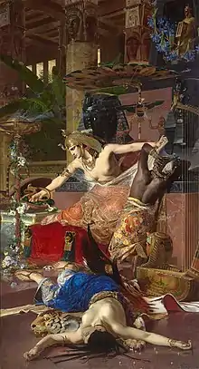 He settled in Rome in 1877 and lightened his palette, somewhat after the style of Giovanni Battista Tiepolo.[4] Upon returning to Stockholm in 1889, he set up a studio in Norra Djurgården and specialized in architectural painting. His motifs were usually taken from mythology or the Bible, as well as works by Shakespeare.