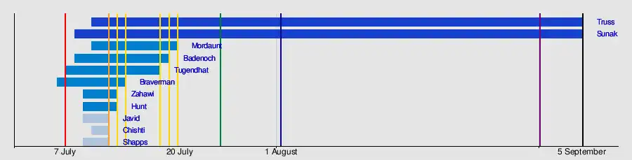 "Graham Brady reveals Liz Truss has been elected as new Tory leader". BBC News. 5 September 2022. Archived from the original on 6 September 2022. Retrieved 6 September 2022. - ↑ Culbertson, Alix (13 July 2022). "Conservative leadership race: Eight MPs left in contest after day of high-profile casualties – and face first ballot in hours". Sky News. Archived from the original on 14 July 2022. Retrieved 14 July 2022.