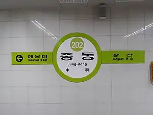 Jung-dong Station (Korean: 중동역; Hanja: 中洞驛) is a station on the Busan Metro Line 2 in Jung-dong, Haeundae District, Busan, South Korea.