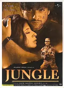 Jungle is a 2000 Indian Hindi-language survival thriller film produced and directed by Ram Gopal Varma. The movie is about a group of bandits, led by forest brigand, "Durga Narayan Chaudhary" (Sushant Singh), that hold a bunch of tourists hostage. It stars Suniel Shetty as Shivraj, the head of police, Urmila Matondkar as Anu Malhotra, one of the hostages, and Fardeen Khan as Siddhu, her love interest.[2] The ensemble cast film has received positive reviews upon release and was declared a Hit.