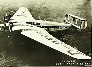 On 1 July 1931 Luft Hansa initiated regularly scheduled service between Berlin and London on flights carrying up to 13 passengers.[1] This London-Berlin service was halted in October 1931 to retrofit the aircraft and expand the passenger cabin of the D-2000. Construction lasted from this time until mid-1932, during which a second deck was built within the D-2000's fuselage—enabling an increased cargo capacity and seating for up to 30 passengers. Additionally the D-2000's engines were again upgraded to four L88s, giving a total power of 2352 kW (3154 hp). Also at this time the D-2000's registration was changed to D-AZUR.