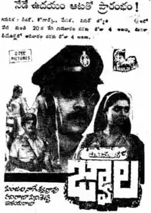 Jwala (transl. Volcano) is a 1985 Indian Telugu-language film, directed by Ravi Raja Pinisetty. The film stars Chiranjeevi in a dual role, Radhika, Bhanupriya and Kannada Prabhakar. The film's score was composed by Ilaiyaraaja. The film was dubbed in Malayalam as Prathikara Jwala.[1][2][3] The film was remade in Kannada in 1987 as Sathyam Shivam Sundaram starring Vishnuvardhan in triple roles ( including the role of the father) unlike this movie.