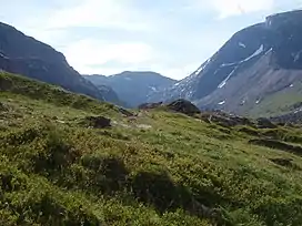 Kärkevagge (Northern Sami: Geargevággi, "Stone Valley") is a short (4 km long) valley in Kiruna Municipality, Sweden. It is easily accessed by a good path from the E10 Kiruna-Narvik highway. Rissajaure, the clearest lake in Sweden, is located at the head of the valley.[1] Karkevagge is noted for the Giant Boulder Deposit (GBD) which fills it with huge jumbled blocks, some the size of houses. One of Sweden's leading geoscientists, Anders Rapp, a world pioneer of quantitative geomorphology, studied the valley for 10 years. He suggested that the parallel rows of blocks had descended in waves from the valleyside cliffs.[2] He estimated the volume of the GBD at 50 million cubic metres. However a large angular cavity beside Rissajaure (top right in picture) has a volume of 42 million cubic metres. The GBD probably descended from it as a rock avalanche and spread down the valley on a glacier, giving it a moraine-like form and visual unity as seen from the air.[3]