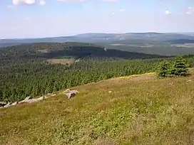 The Königsberg is a neighbouring peak of the Brocken and, at 1033.5 m above sea level[1] the third highest elevation in the Harz mountains. It lies on a long ridge that runs from southeast to northwest about 1.5 km south of the Brocken's summit. Near its summit on the northwest side is the rock formation of Hirschhörner (max. 1,023.2 m).[1] To the east the land descends to the Schwarze Schluftwasser, a small tributary of the Kalte Bode which flows south of the mountain. To the east on the far side of the Schwarzer Schluftwasser is the Heinrichshöhe (1,039.5 m), another subpeak of the Brocken.