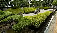 Located next to the main hall, the rock garden consists of white raked gravel, some rhododendrons and eight rocks. Each rock represents a saint or a god. The group of three to the left, surrounded by plants, represent the Amida trinity, with Amida Amida Nyorai at the center, Seishi to the left and goddess Kannon to the right.[1]