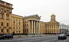 The headquarters of the State Security Committee (Russian: Здание КГБ, Belarusian: Будынак КДБ) is located on Independence Avenue at the corner from Komsomolskaya Street. The building was built between 1945 and 1947 by architects Mikhail Parusnikov and Gennady Badanov.[5] The building was erected in the style of Stalinist Architecture and Neoclassicism. The left wing stretches across Independence Avenue to adjoin the neighboring House of the Minsk Mutual Agricultural Insurance Association.