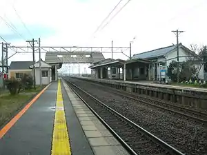 - ↑ 駅 別 運 輸 実 績 [Station passenger figures (Fiscal 2015)] (PDF) (in Japanese). Japan: Ishikawa Prefectural Government. 2016. Retrieved 2 January 2018.