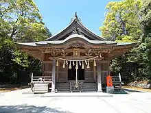 The Ni-no-miya, or secondary shrine, is dedicated to Fujiwara no Hirotsugu, the imperial prince and the eldest son of Fujiwara no Umakai. Hirotsugu petitioned for the removal of Genbō; and then Kibi no Makibi and Genbō used this complaint as a pretext to discredit Hirotsugu.[1] As a result, Hirotsugu initiates a futile military campaign in September 740. The shrine was built in 750 by Kibi who was exiled to Dazaifu on the island of Kyushu, ten years after the execution of Hirotsugu.[2] At the time of Genbō's death, it was popularly believed that he was killed by the vengeful spirit of Hirotsugu.[3]