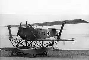 Imperial German Navy seaplane Number 945 was the sole example of a unique seaplane design produced during the First World War.[1][2][3][4] Throughout the war, the Kaiserliche Werft Wilhelmshaven had been producing small numbers of training seaplanes for the German Navy, but as the conflict continued, they built a small number of armed types as well, including Number 945.[1] While the general layout of this aircraft was conventional enough for its day, it included a number of unusual features. The single-bay wings were braced with single, large I-struts, and the vertical stabiliser was virtually non-existent, consisting of little more than a stub on the dorsal side of the rear fuselage.[2] The rudder was hinged to the end of the fuselage and hung down below it.[2] The Navy classified it as a C3MG type; indicating armament with both fixed and trainable machine guns.[5]