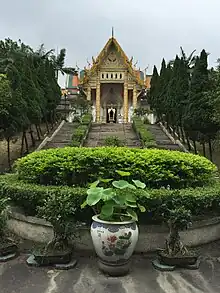 In 1991, Buddhist monk Dingran (定然) was elected as abbot. During his term in the position, Thai Chinese, Upasika Xie Huiru (谢慧如) donated property to establish a Thailand style Buddhist Hall known as "Taifo Hall" (开元寺泰佛殿 with a Buddha image of Maravijaya attitude enshrined in the hall.[1]