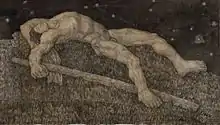 In Estonian (mainly East Estonian) legends, Kalevipoeg carries stones or throws them at enemies, and also uses planks edgewise as weapons, following the advice of a hedgehog.[3] He also forms surface structures on landscape and bodies of water and builds towns. He walks through deep water. Kalevipoeg eventually dies after his feet are cut off by his own sword owing to his own prior—and fatally ambiguous—instructions.