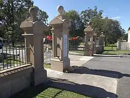 On Saturday 23 October 1920, Brigadier-General L.C. Wilson officially opened the war memorial gates at Kalinga Park at the end of Park Street (27°24′28″S 153°03′07″E / 27.4078°S 153.0519°E) to commemorate the service of local men in World War I. Between 200 and 300 people attended the ceremony. The gates were designed by Andrew Lang Petrie who also did the carving of the Helidon sandstone while the steelwork was done by Mr Rodgers.[8]