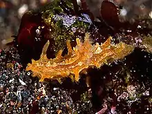 The living animal has a general orange coloration. The whole dorsum has brown dots except at the apices of the lateral appendages, which are pale yellow. These brown dots are similar and size and regularly distributed. The dorsum has an opaque white, irregularly shaped line, which runs from the front of the head to the posterior end of the notum. This line bifurcates at the level of the branchial leaves, where it surrounds them and remerges again behind the branchial leaves. The posterior end of the foot is thin and acute and has a yellow color similar to that of the lateral appendage apices. Two types of appendages are observed in the specimen. The first type of appendages is the longest and widest. There are three pairs of these lateral appendages situated along the margin of the sides. These appendages have a ramified apex. Each ramification of the apex has a rounded base and a long, thin and sharp prolongation. The whole length of each of these appendages is covered by little and acute ramifications. The second type of appendages, are thin, long with many small sharp, thin and long simple ramifications. These appendages are present on the sides of the body, foot, dorsum and oral veil in number 15–17 per side with 6 on the oral veil. The rhinophores have a lamellate clavus and a peduncule with little, thin and sharp ramifications. Each rhinophoral sheath edge has three ramifications. The middle one is virtually identical to the lateral appendages. The other two ramifications are similar to the smaller tentacles of the rest of the body. The oral tentacles are simple folds of the mantle that have a cylindrical shape. There are three tripinnate branchial leaves. They present long, simple, and thin ramifications as the smaller appendages.[1]