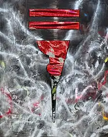 Kaloust Guedel's work explores contemporary issues often taking a critical stand on various societies shortcomings. Throughout the years, it has explored subjects as genocide, war, abuse and others.[8] Regardless of the styles and technics he has employed, his work has been consistent with contemporary sensibility and has reflected the consciousness of its time. Guedel is the first artist who used vinyl as a medium in paintings. He has been featured in publications like Masters of Today and has been known to explore capitalism and excess in his minimalist conceptual artworks.[9]