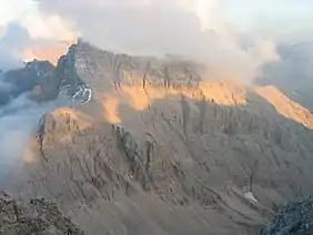 The Kaltwasserkarspitze is a mountain in the Hinterautal-Vomper Chain and, at 2,733 m (AA) m, is the fourth highest peak in the Karwendel mountains in Austria after the Birkkarspitze, Middle and Eastern Ödkarspitze. The Kaltwasserkarspitze is the eastern neighbour of the Birkkarspitze, its rugged summit dropping in a steep rock face to the valley of Kleiner Ahornboden. A long arête heads south from the mountain, on which are the Sägezähne ("saw teeth") and the Großer Heißenkopf (2,431 m (AA)) and which separates the Östliche Birkkar from the Raukarl.